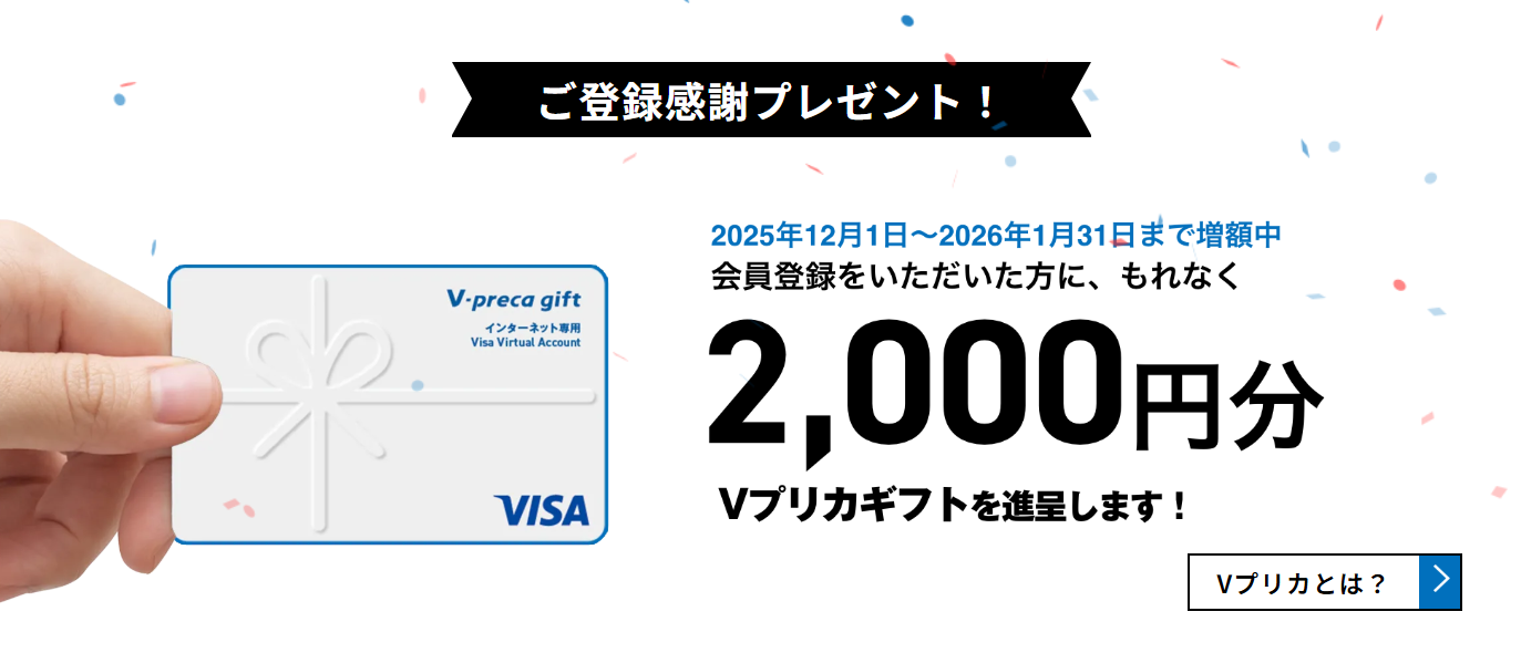 現在、新規会員登録で2,000円分のV-プリカのプレゼントキャンペーンを行なっていますが、当サイト限定でAmazonギフト券1,000円分も追加でもらえます!