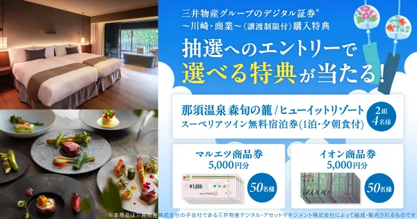 | 内容 | 「三井物産グループのデジタル証券~川崎・商業~(譲渡制限付)」購入者の中から抽選で豪華特典をプレゼント 那須温泉 森旬の籠/ヒューイットリゾート 無料宿泊券(1泊・夕朝食付):2組4名 マルエツ商品券5,000円分:50名 イオン商品券5,000円分:50名 |