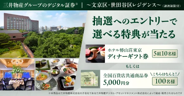 | 内容 | 「文京区・世田谷区レジデンス」へ投資した方の中から抽選で豪華特典をプレゼント ホテル椿山荘東京 ディナーギフト券:5組10名 全国百貨店共通商品券5,000円分:100名 |