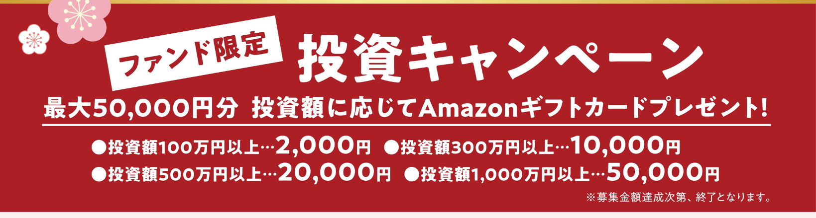 ファンド募集の際には、投資額に応じてAmazonギフトカードのプレゼントキャンペーンを実施しています。
