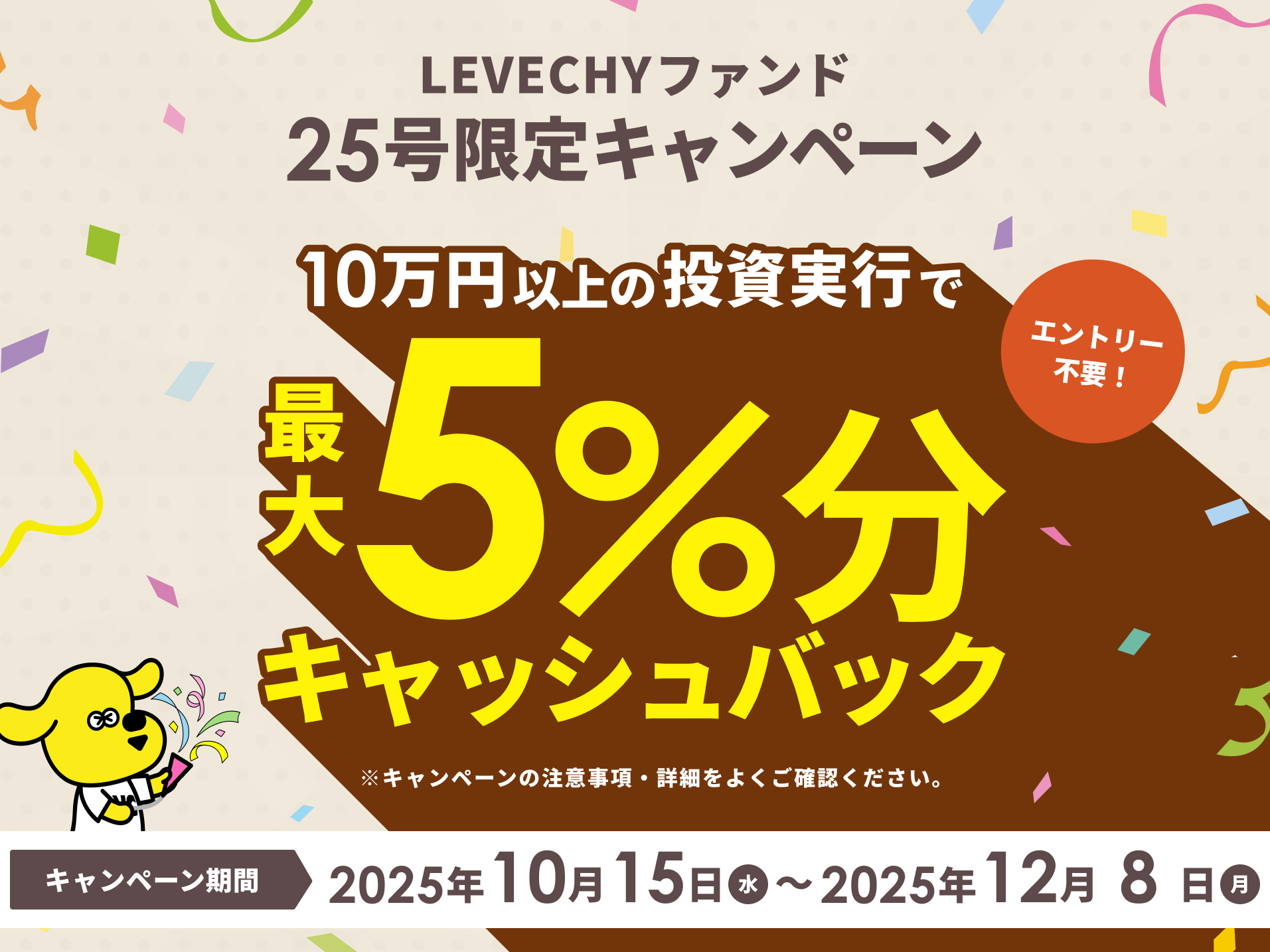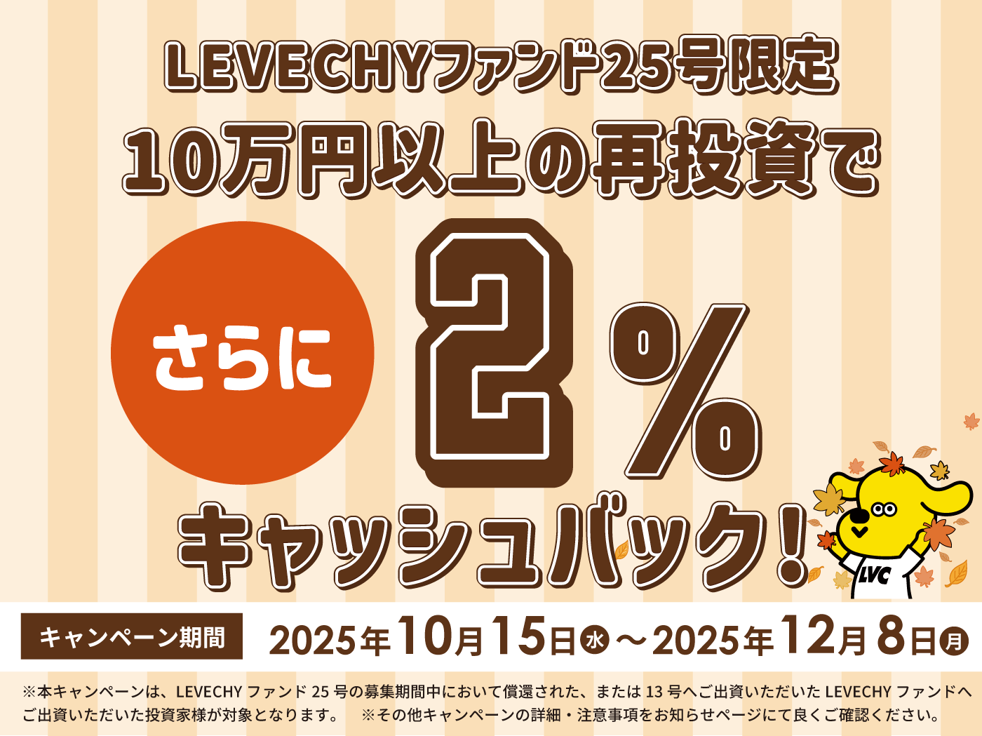 | 内容 | LEVECHYファンド25号の募集期間中において、 ・償還されたLEVECHYファンド ・またはLEVECHYファンド13号に出資 いただいた投資家様を対象に、LEVECHYファンド25号に10万円以上再投資いただいた場合、もれなく2%の現金をキャッシュバック |