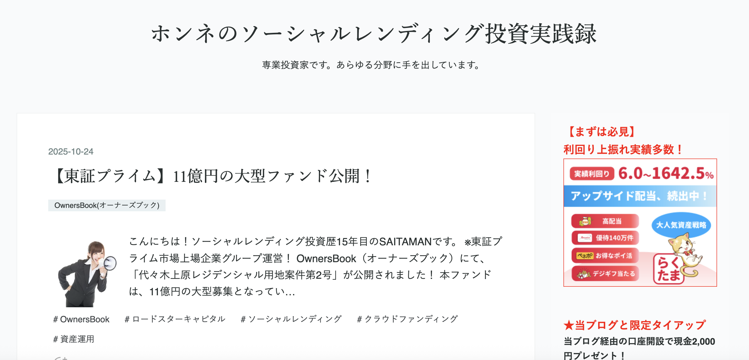 ソーシャルレンディング関連の記事も多く、最新のキャンペーンなどもブログに書いてあるので、必見です。