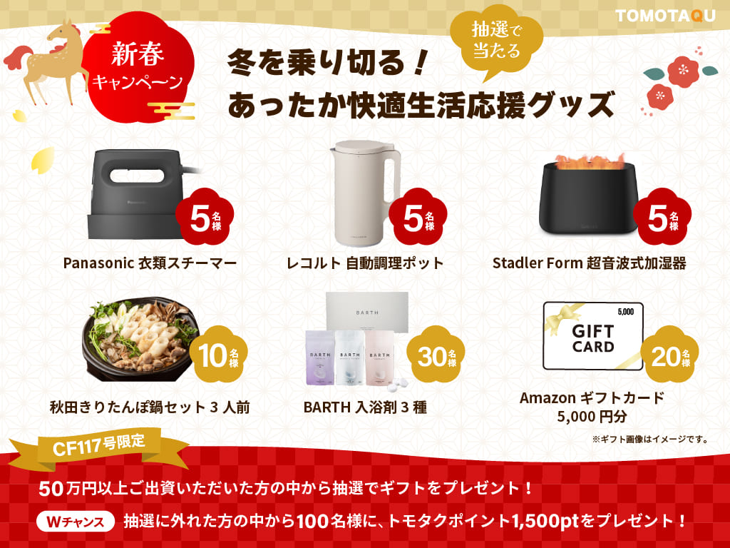 | 内容 | CF11号(3エリア分散型ファンド)へ50万円以上投資した方を対象に、抽選で冬を乗り切るあったか快適生活応援グッズをプレゼント |