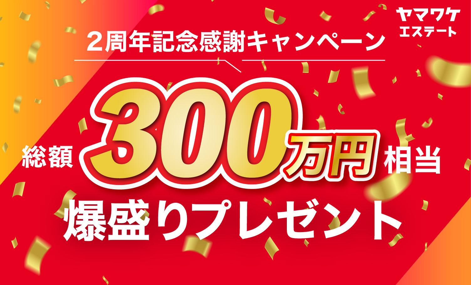 ヤマワケエステートでは現在総額300万円相当爆盛りプレゼントキャンペーンを実施しています。(2025年9月時点)
