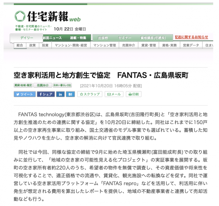 【掲載情報】住宅新報(2021年10月20日)空き家利活用と地方創生で協定 FANTAS・広島県坂町