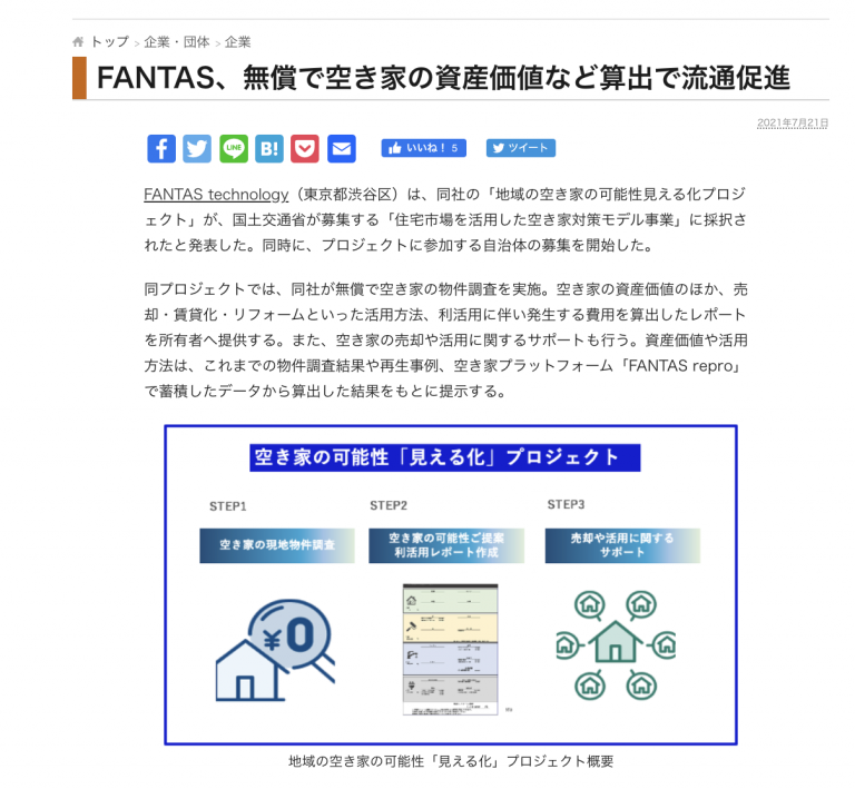 【掲載情報】新建ハウジング(2021年7月21日)『FANTAS、無償で空き家の資産価値など算出で流通促進』