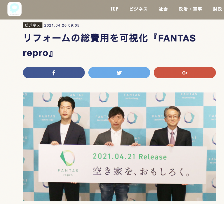 【掲載情報】不動産経済オンライン(2021年4月22日)『修繕コストを見える化した中古住宅流通サイトを開設 1年で250社の参加目指す ー FANTAS technology』
