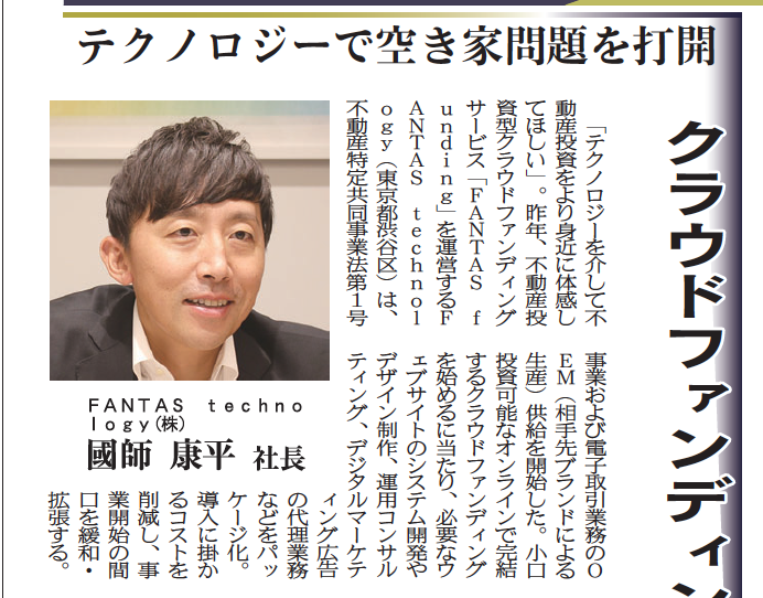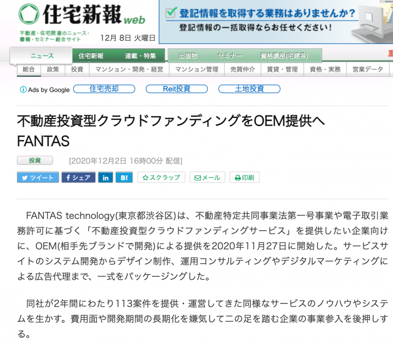 【掲載情報】住宅新報(2020年12月2日)『不動産投資型クラウドファンディングをOEM提供へ FANTAS』
