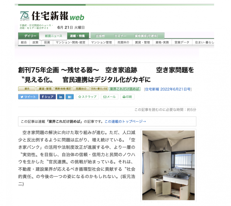 【掲載情報】住宅新報(2022年6月21日)創刊75年企画 ~残せる器~ 空き家追跡 問題を〝見える化〟官民連携はデジタル化がカギに