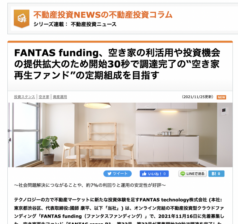 【掲載情報】LIFULL HOMES(2021年11月25日)『FANTAS funding、空き家の利活用や投資機会の提供拡大のため開始30秒で調達完了の“空き家再生ファンド”の定期組成を目指す』