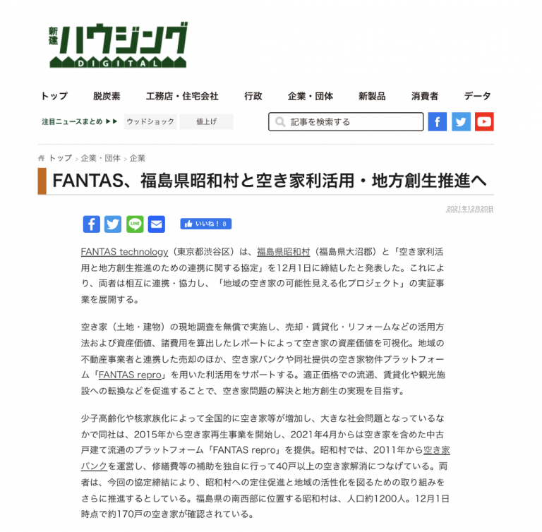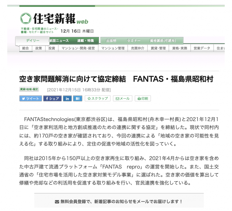 【掲載情報】新建ハウジングDIGITAL(2021年12月20日)FANTAS、福島県昭和村と空き家利活用・地方創生推進へ
